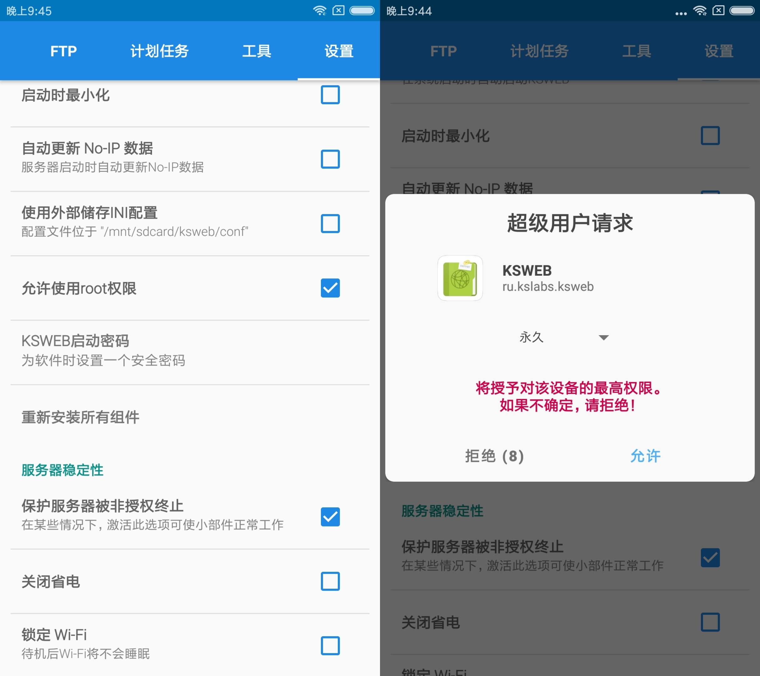 - 安装完ksweb后打开,在顶部划到最右侧点击设置,下滑将「允许使用root权限」开关打开,以防止在后台运行时被杀;