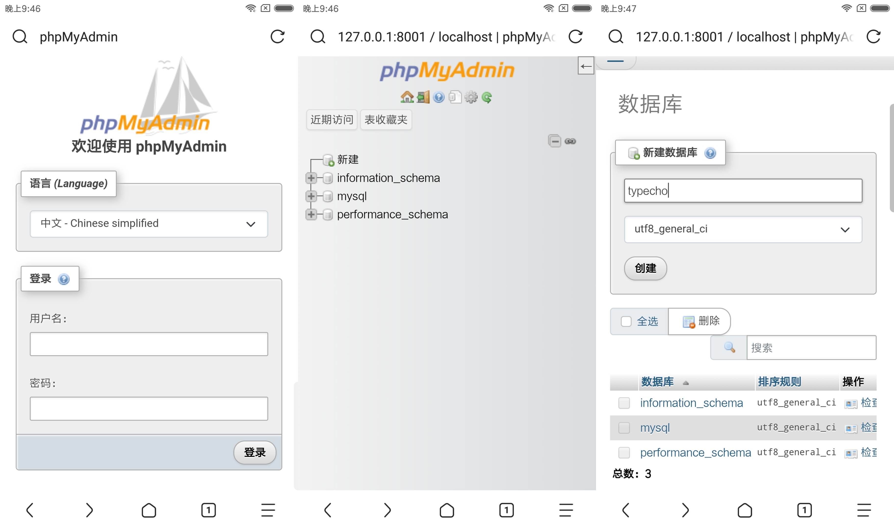 - 接着我们返回软件,点击「主机0」它会自动跳转到phpmyadmin的页面,「用户名为root,密码不用填」,登录后点击新建,数据库名随意,这里我填写Typecho,完成后点击「创建」