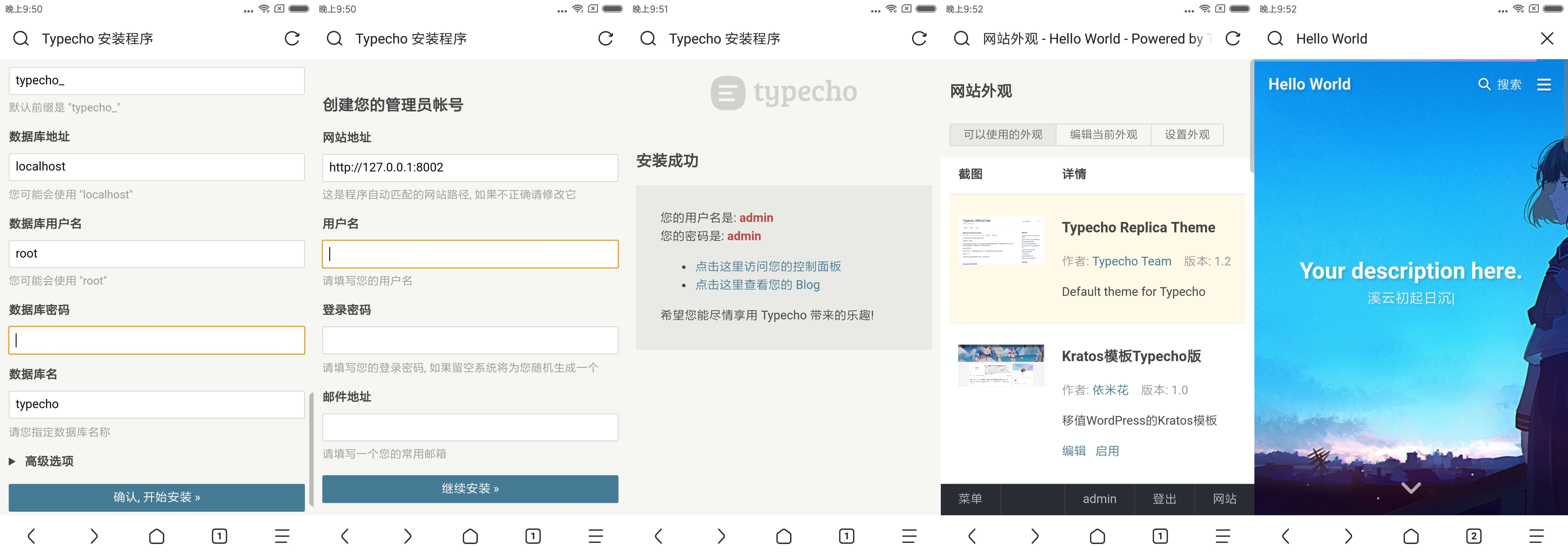 - 在上一步完成后,点击来到了以下页面,「数据库用户名填写root,数据库名填写你所写的」,接着下一步就按照个人喜好填写,最后就会来到安装成功的页面,你可以点击「点击这里查看您的blog」,也可以点击「点击这里来访问您的控制面板」,如果你的Typecho的文件是由我提供的,依次点击「菜单-外观」选择一个你喜欢的主题并点击「启用」最后点击右下角的「网站」就可以访问你的blog啦