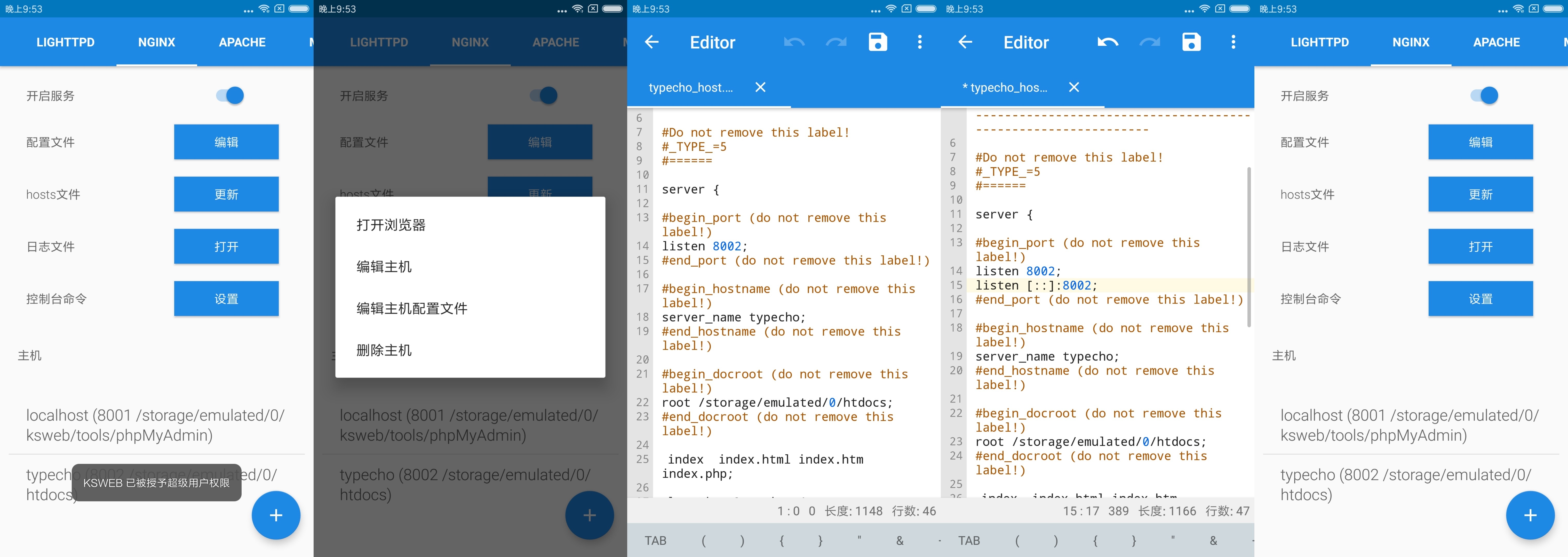 - 最后一步回到ksweb软件中,点击「NGINX」,选择主机下的第二个,然后点击编辑主机文件,找到「listen 8002」回车,在下面加入一行「listen [::]:8002;」保存文件,并点击两下「开启服务」,这样你的网站就开启了ipv6访问啦,这里的8002为端口号,可以随意更改的,已你自己所输入的端口号为基准