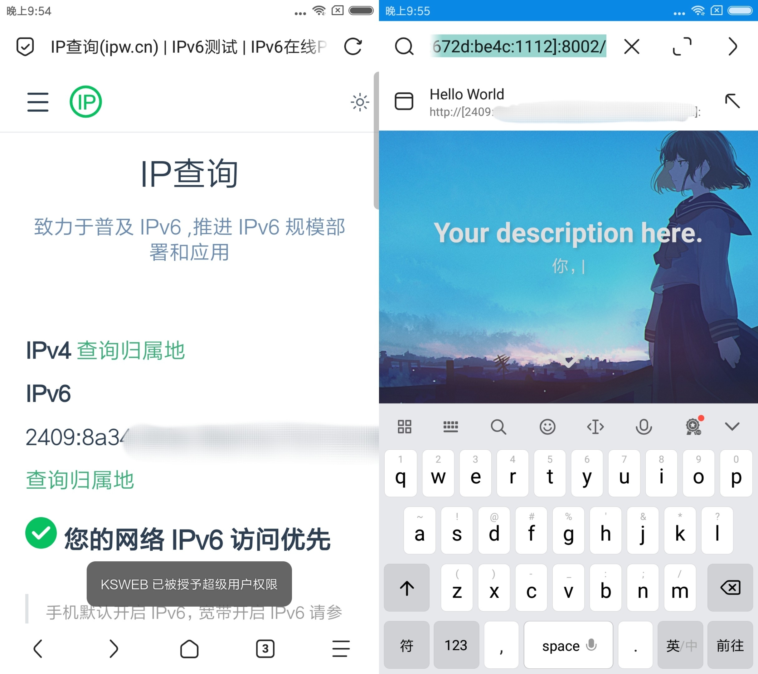 - 在浏览器中输入「ipe.cn」可以查看你ipv6的地址,将博客地址「http://localhost:8002」中的「localhost」替换为「[你的ipv6地址]」,就可以愉快的通过ipv6来访问你的博客啦,可以关掉WiFi,用流量来访问哦,如果无法访问就检查下路由器的防火墙!